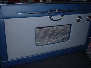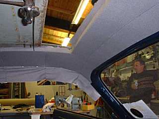 | High standard re-trim in progress, doesn't the door trim look gorgeous? | Headlining going in - trimmer enjoys a cuppa during the work | Map netting under the roof, plus new leather boot panel. |