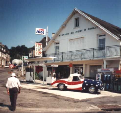 In this picture, Jim Miller takes petrol after the lunch stop at Pont d'Ouilly. |